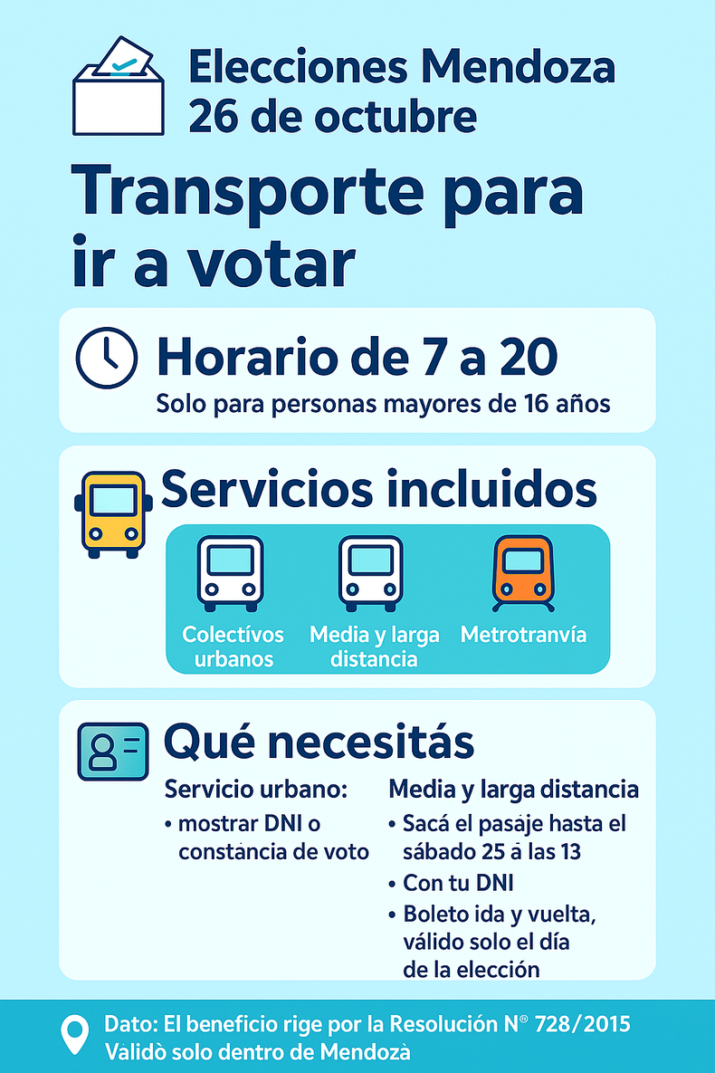 Con esta medida, Mendoza garantiza el traslado gratuito para todos los ciudadanos y ciudadanas que participen de las elecciones legislativas, promoviendo la movilidad accesible y el ejercicio pleno del derecho al voto en toda la provincia.
