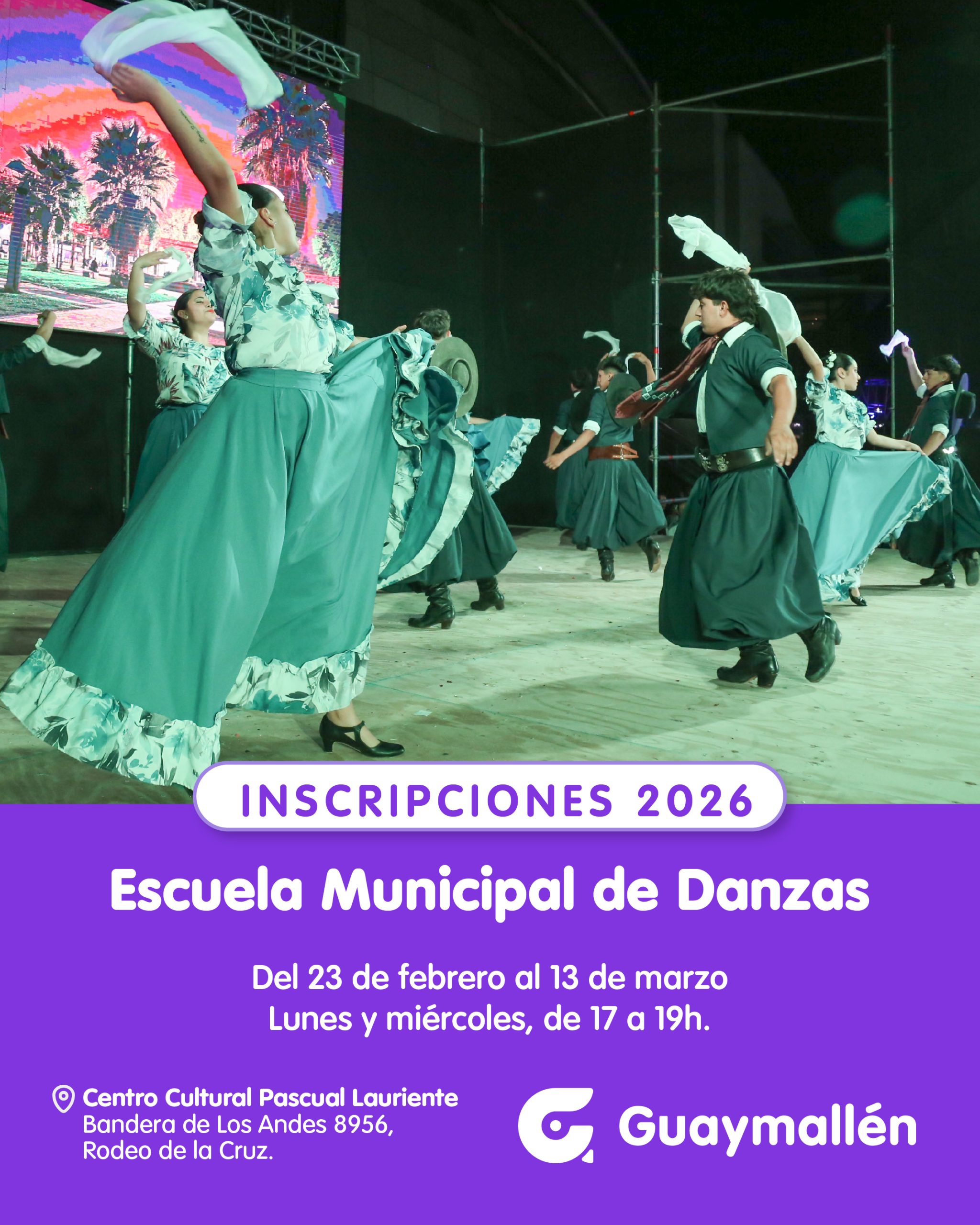 Desde el próximo lunes 23 de febrero hasta el 13 de marzo, niños, jóvenes y adultos que deseen formar parte de la Escuela Municipal de Danzas de Guaymallén, podrán anotarse en el Centro Cultural Pascual Lauriente, los días lunes y miércoles de 17 a 19h.