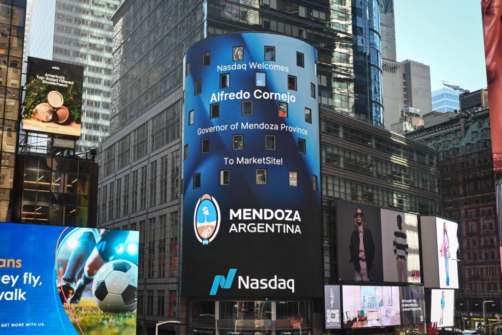 La ministra de Energía y Ambiente participó en Nueva York de la ceremonia de apertura del Nasdaq MarketSite en Times Square, en el marco de la Argentina Week. Acompañada por el CEO de Impulsa Mendoza, Sebastián Piña, también mantuvo reuniones con directivos de la bolsa para dialogar sobre las oportunidades de la provincia en materia de energía renovable y minería.